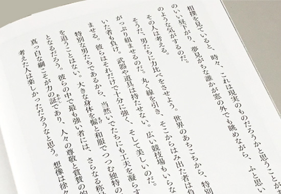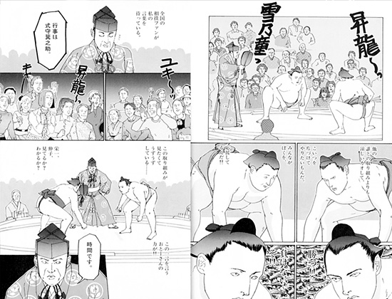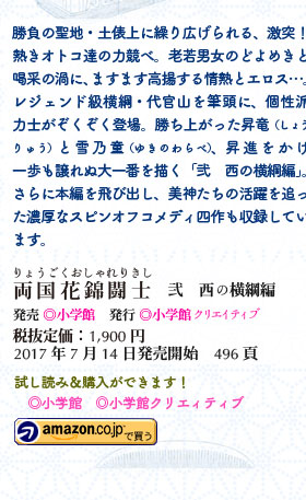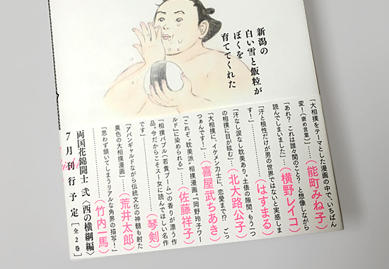 東の巻と西の巻の2冊にまとまる『両国花錦闘士』、できあがった『壱 東の横綱編』を見ると、おおお、なんだか化粧まわしを締めたお相撲さんのよう。